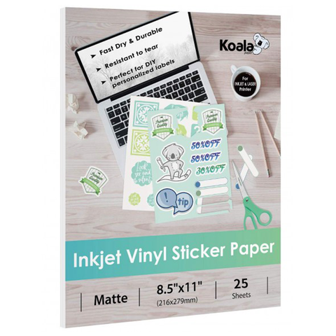 Koala Waterproof Matte White Vinyl Sticker Paper – Laser Printer Compatible, Printable Adhesive Sheets, 8.5x11", 20 Sheets